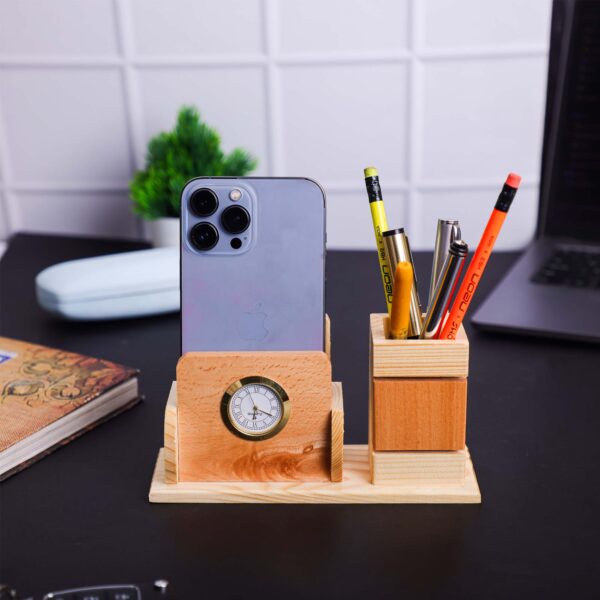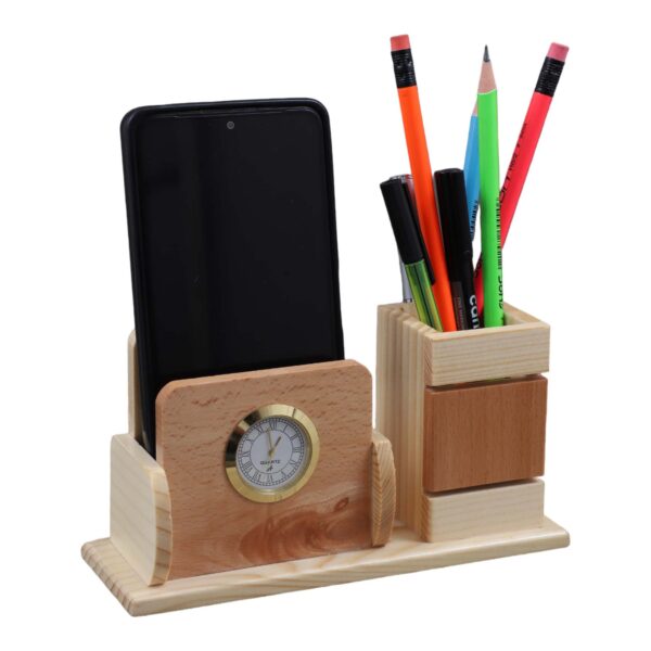 Wooden Pen Holder & Stationery Organizer Stand with Clock and Mobile Phone Holder Made with Pine Wood for Office Desk and Study Table