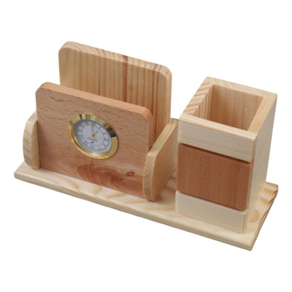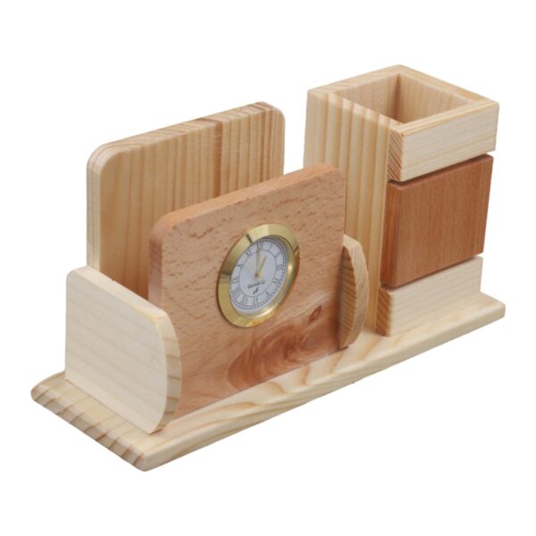 Introducing our exquisite Wooden Pen Holder crafted with precision from high-quality pine wood, combining functionality with timeless aesthetics. This elegantly designed desk accessory not only serves as a convenient organizer for your writing essentials but also incorporates a clock and a mobile phone holder, adding a touch of sophistication to your workspace.