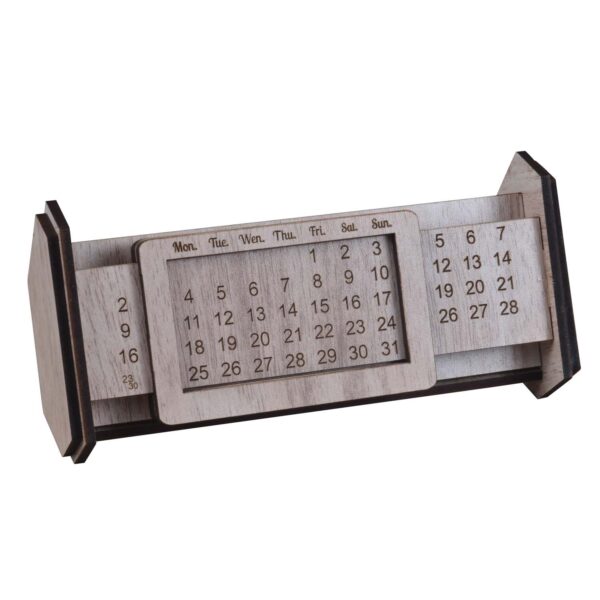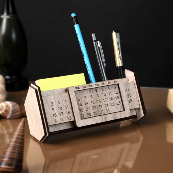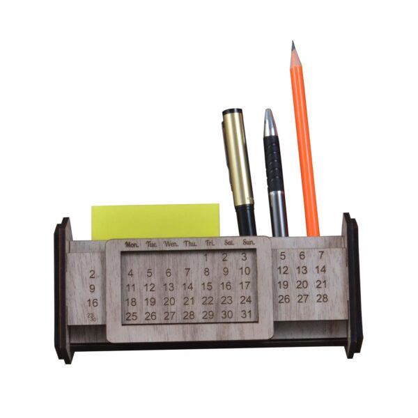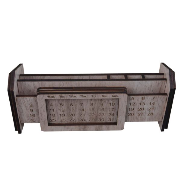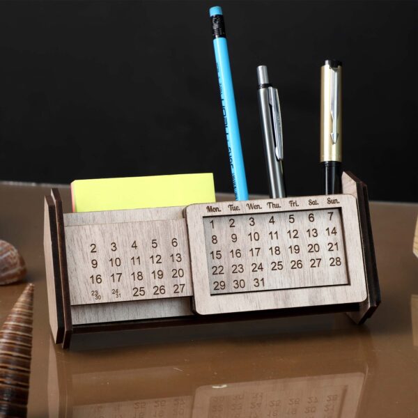 MDF pen stand with integrated infinity calendar for date reference.