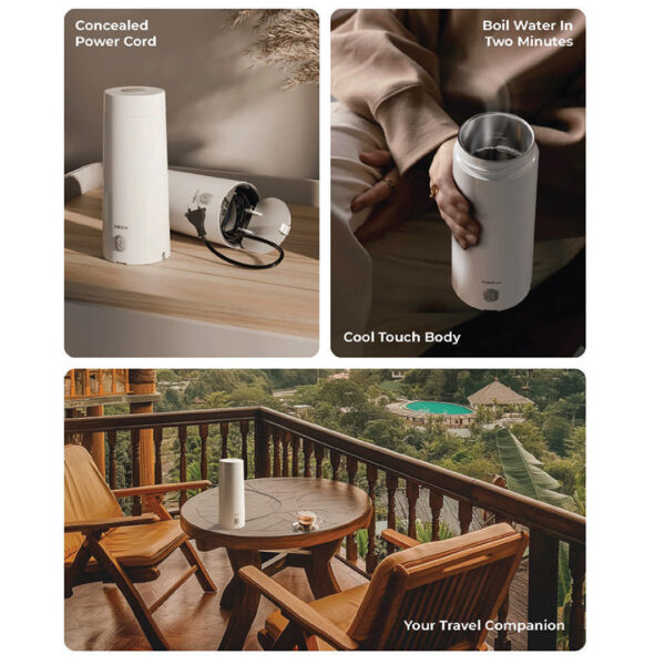 Portable Travel KEttle 1. Concealed Power Cord. 2. 300W power. 3. 400 ml Capacity. 4. ISI Certified Power Cord. 5. Multy Voltage Adapt.